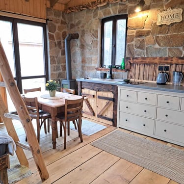 W środku znajdziesz przytulnie urządzone pomieszczenia z aneksem kuchennym, łazienką, kominkem lub kozą grzewczą.